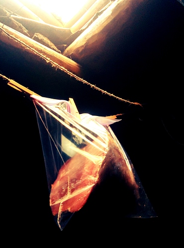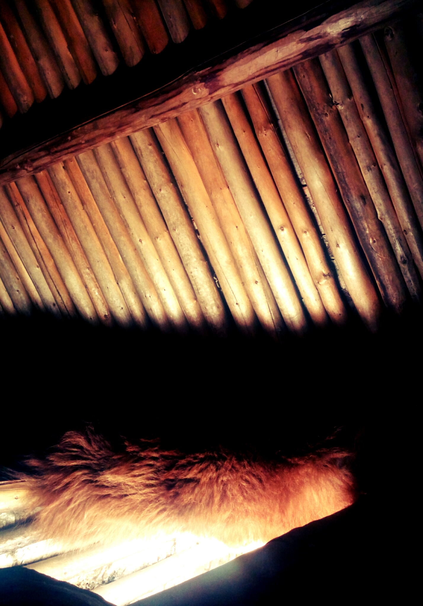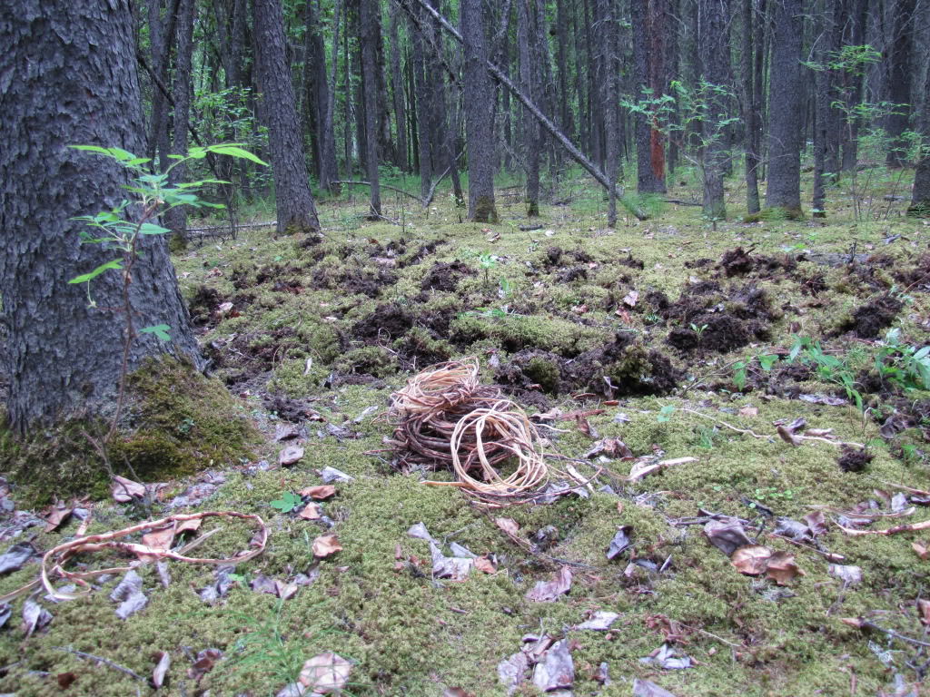 Spruce root: Spruce root was gathered peeled and split to be used for sowing the birch bark roof panels together