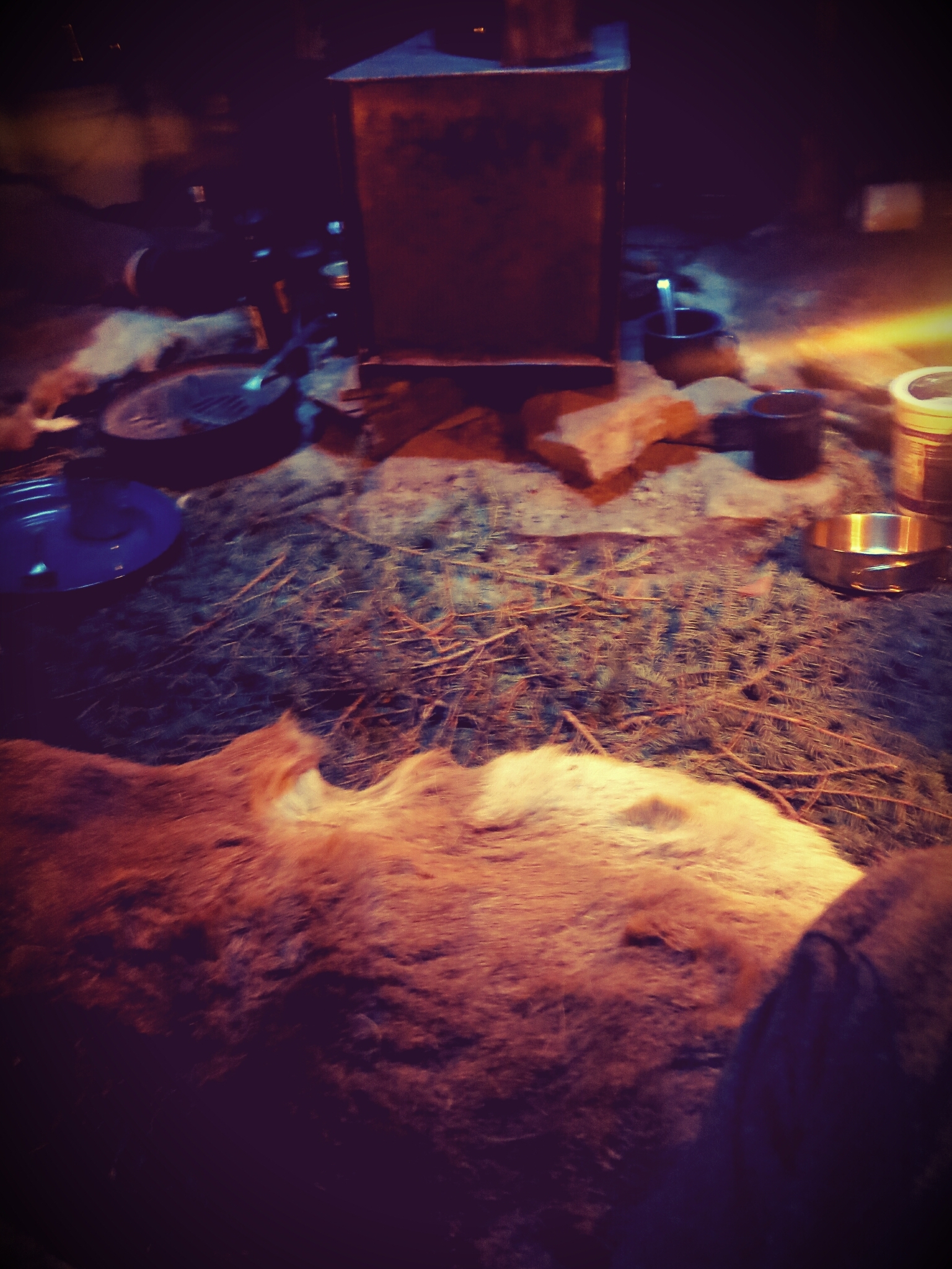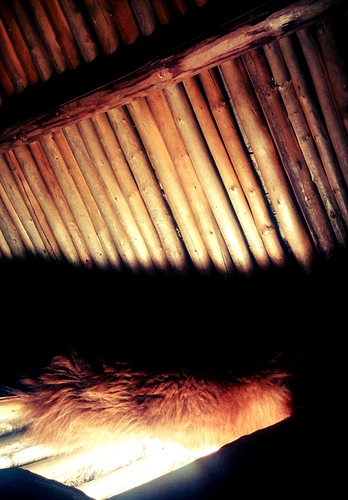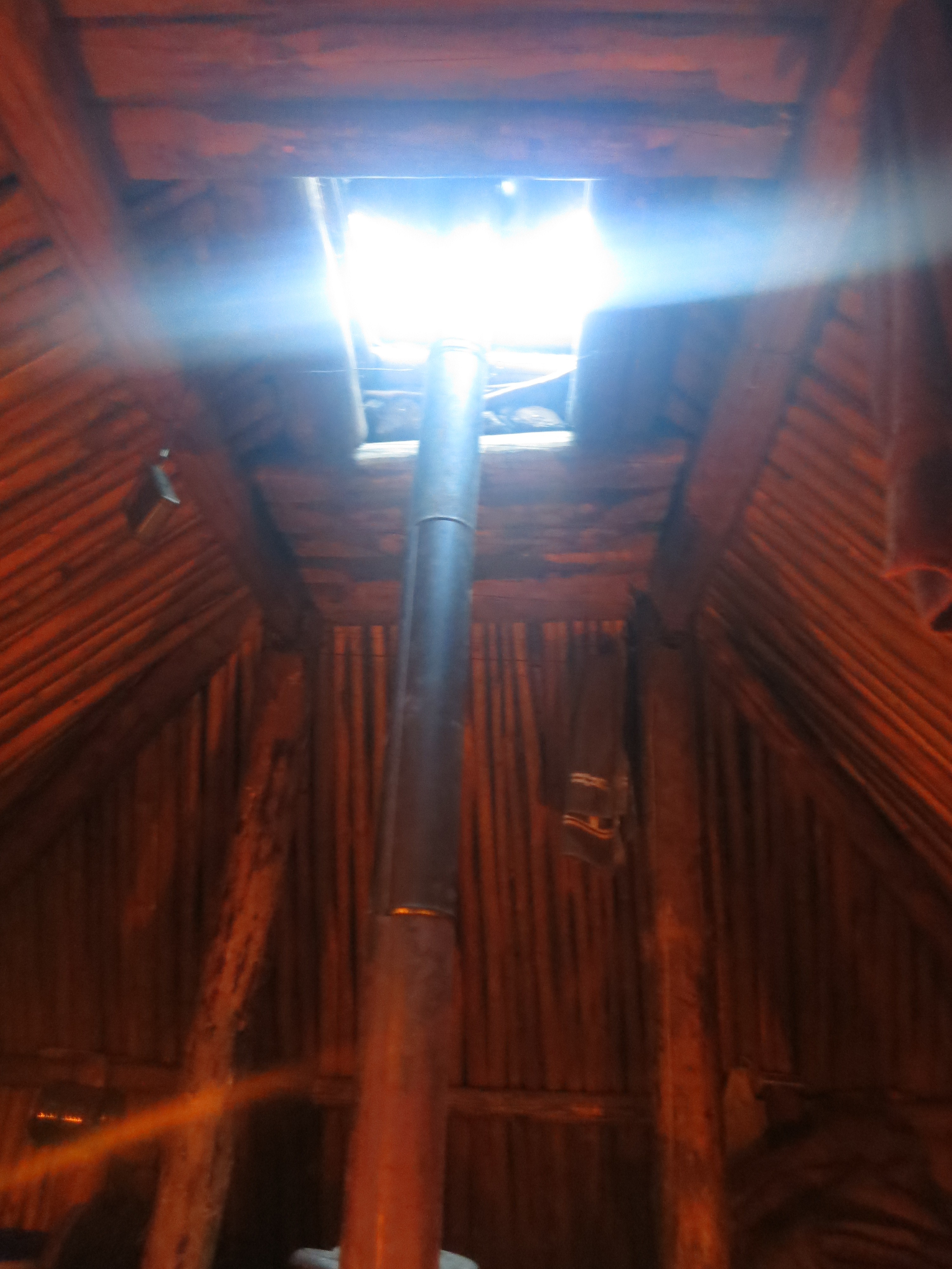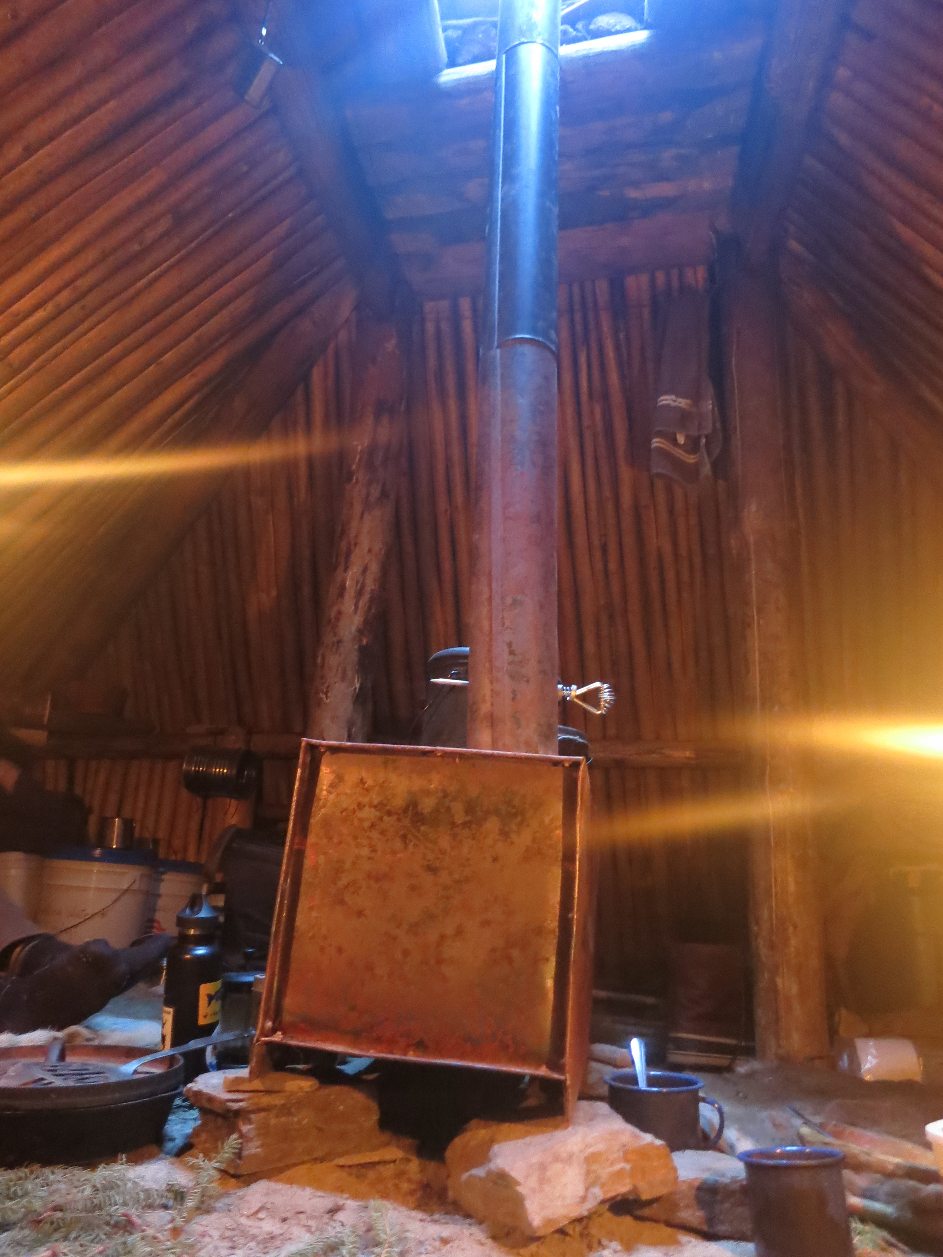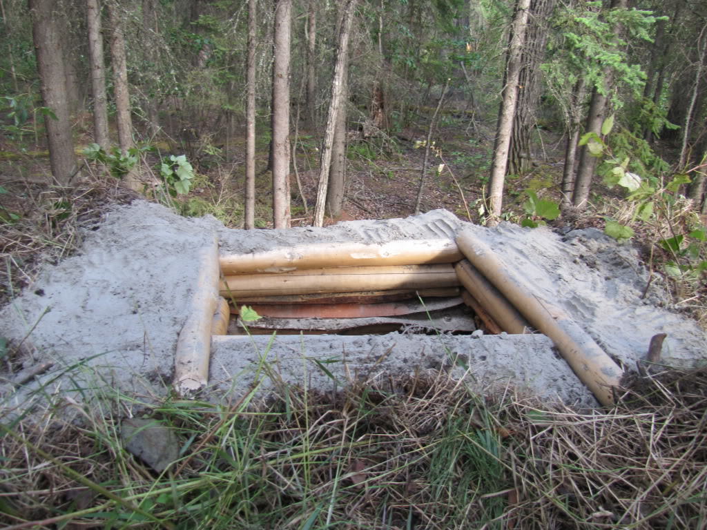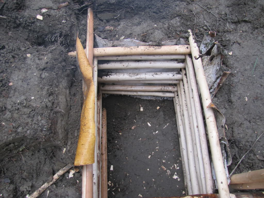 the entryway was cribbed with spruce polles and birch bark. It is thirty inches lower than the floor. It forms a short tunnel which has a roof at the same height as the lodges floor. In this way all the warm air in the lodge will be static