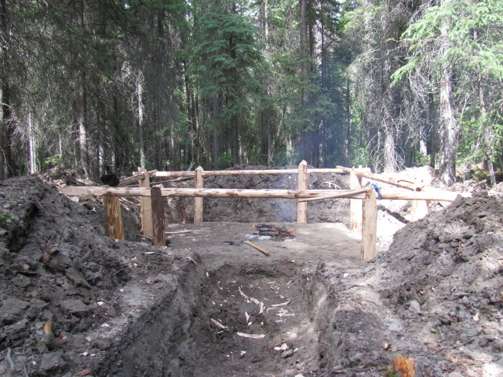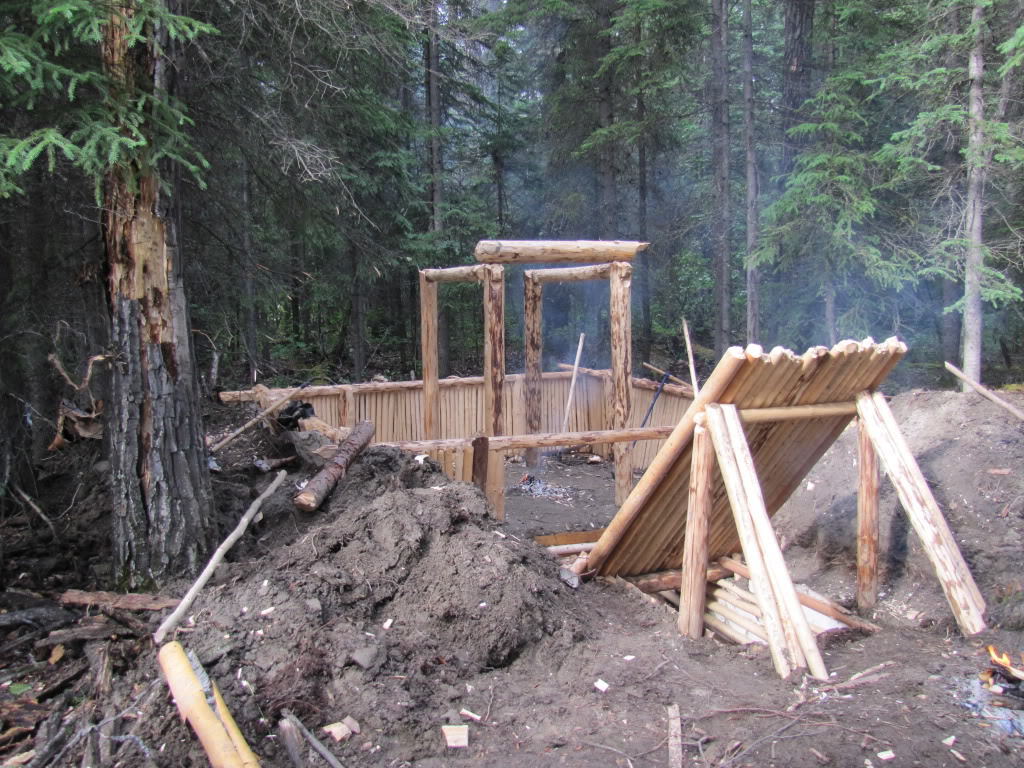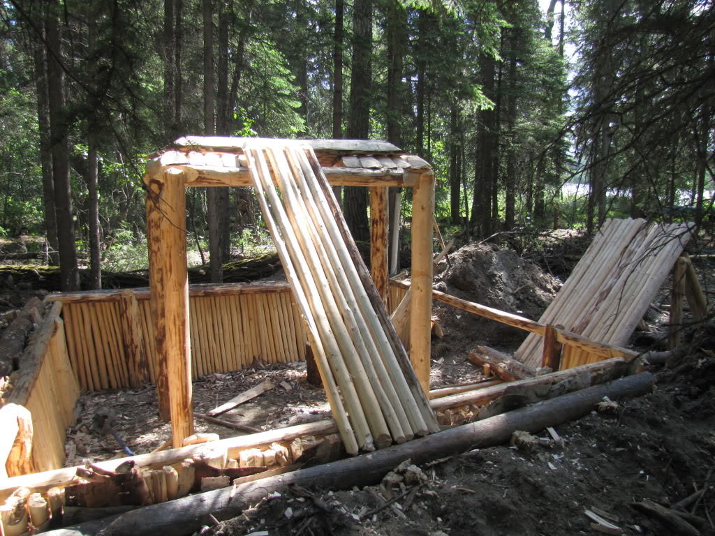 the retaining wall is 3 feet tall so that someone sitting against the wall will not hit their heads on the roof beams. spruce polls were driven in behind the beams at a slight outward angle. Birch bark was placed behind the poles to keep silt from drifting into the lodge. The silt from digging the hole was then filled in behind the retaining wall.