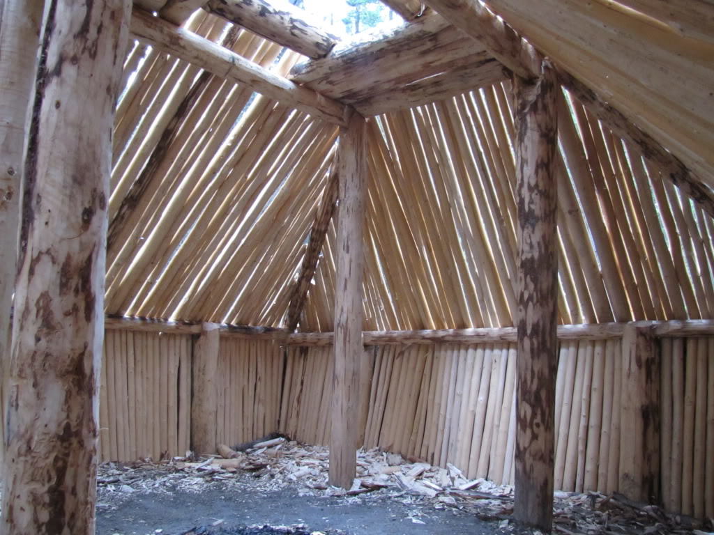 posts and beams were raised that will eventually hold the roof polls. The posts were notched with the scoop adz. The beams frame the smoke hole in such a way that it can not be crushed and is held together by the weight of the future roof