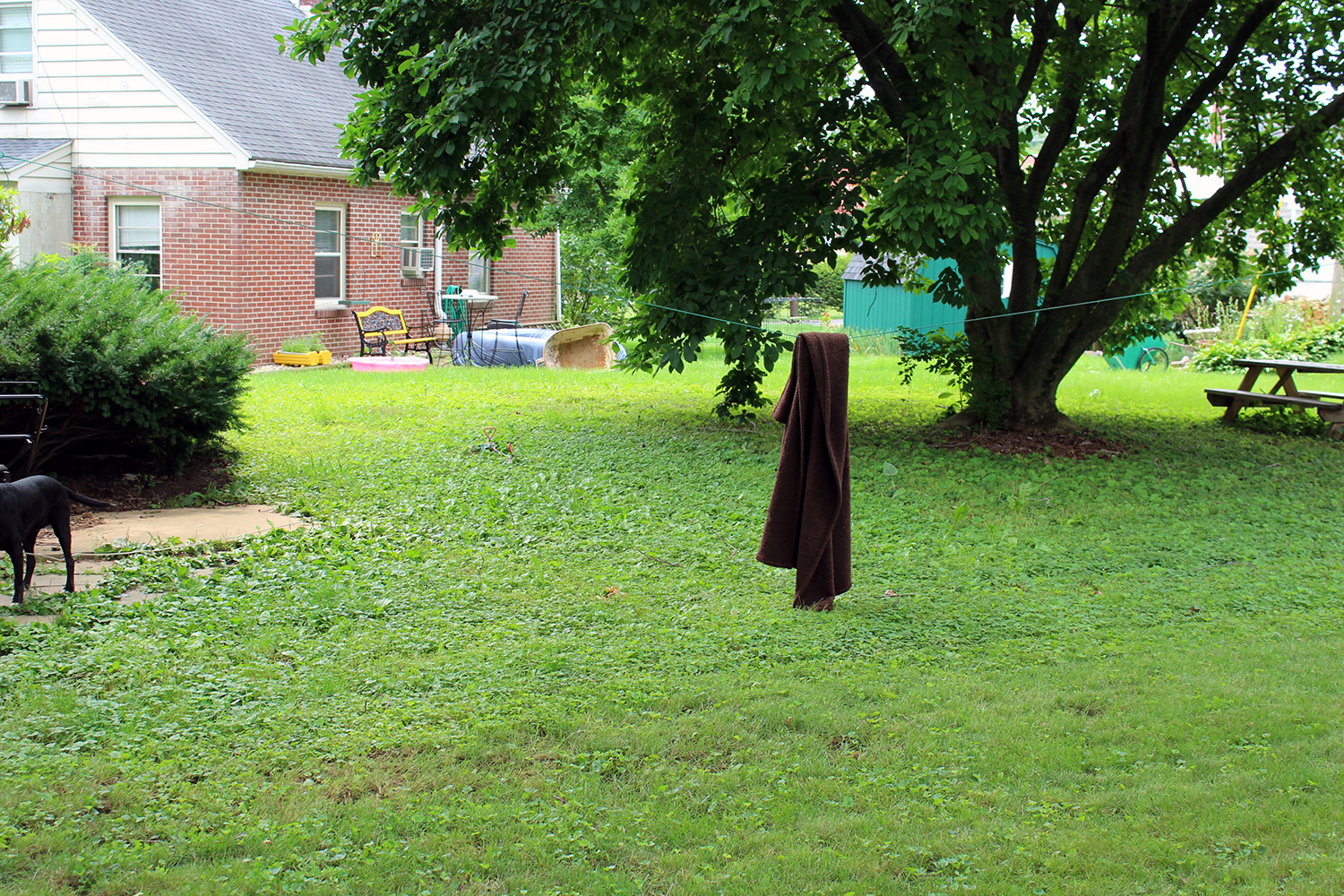 This shot is from my neighbor’s yard across her backyard, ours, and then the neighbor on the other side. Had I taken this shot before the last 4 weeks when we were in drought-like conditions would be brown, green and brown. Kentucky Bluegrass is particularly prone to wear from heat, drought and lack of rain. Our neighbors lawns were dying and ours was still a fairly lush green. That’s how little KB is left out back and increasingly less in front and on the sides.