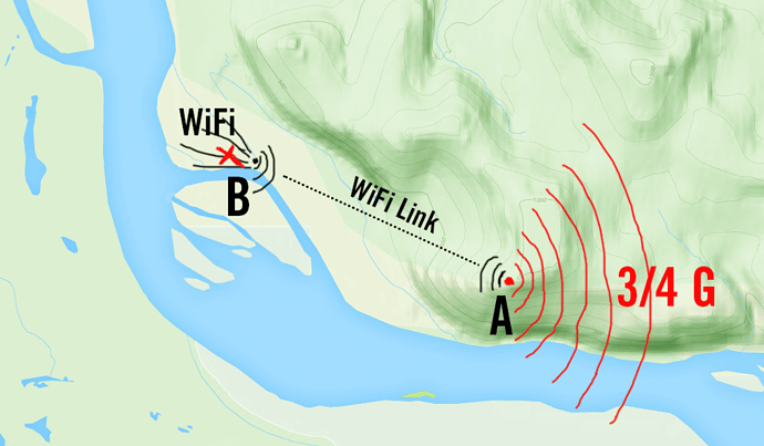 - 3/4G Cellular repeater/booster at the property itself (B in the image)